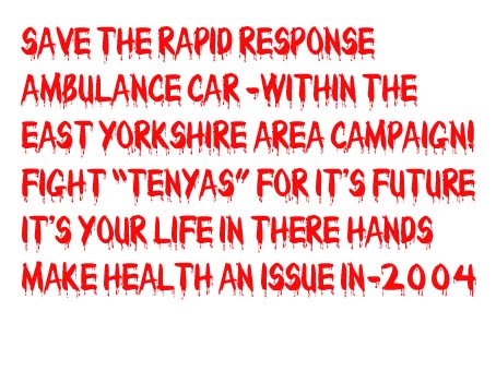 We believe the affected areas are; Bridlington, Driffield, Hornsea, Beverley, Withernsea and Hull area and all rural area within this region; most of the 6 R/R/V’s are parked up in ambulance station within the East Riding area; how can TENYAS management go ahead and make cuts without informing the general public; the very people who pay there wages reflected in there taxes. We believe the healthcare in the East Riding of Yorkshire is predominately elderly; relatively affluent healthy and aging but the population is well scattered throughout this rural area; to withdraw these R/R/V’s will only increase such problems within the existing ambulance service. I am disappointed; but not particularly surprised, by TENYAS behaviour; the more remote that these organisations become, the less in touch they are with the needs of local residents. They tend to forget that they are a public body and answerable to the public. I can report; numerous e-mails (too many to count) have been sent to the Chief Executive of TENYAS Mrs Jayne Barnes CBE all have drawn a blank; I am very dissatisfied with the negative response and the unenthusiastic discourteousness of this very delicate topic and scenario; I will continue to ask the very important questions that everyone would like to know the answers too; but no one; but no one can understand why TENYAS cannot be honest and accurate to the very people who pay there wages reflect in taxes. The Rt. Hon. Greg Knight MP as now taken up the case and will be responding to his constituents in due course; other Councillors and MP’s are supporting Mr Knight MP. Once again a call for a Public Inquiry and Full Accountability should be called for.