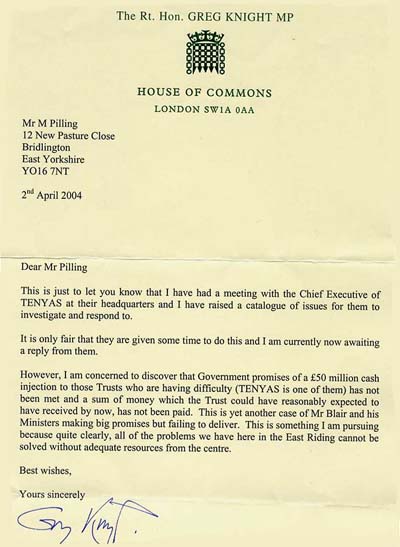 Tuesday, 06 April 2004 Please find the enclosed letter for scrutiny; it's to do with the prearranged meeting held by The Rt. Hon. Greg Knight MP and Chief Executive of TENYAS Jayne Barnes . This letter clearly explains the problems within the Ambulance Service; once again money being the problem and Central Government not releasing the necessary funding in order for these vital services to operate in a responsible and safe manner to give the public what they expect. When all's said and done the money with-held is in fact Tax-payers money paid in over the years. Mr Knight MP contacted me recently and asked me to put together a list of vital questions which he intended to put to the Chief Executive of TENYAS Jayne Barnes ; he is now waiting for the answers; the above meeting with TENYAS is a direct result of the Save/Support Bridlington Hospital Campaign raising the issue of the Rapid Response Vehicle (First Responder) been with-drawn from Bridlington and given to Hornsea; I believe the people of Bridlington and district are completely fed-up with playing second fiddle to all the health service issues and cuts thrust upon the people within the East Riding of Yorkshire. Lets all hope that the questions put to TENYAS Chief Executive are resolved and truly accurate answers given? No more as been heard at present on the crucial staffing situation at the Bridlington Hospital 's Minor Injuries Unit; this issue has also been taken up by: the Rt. Hon. Greg Knight MP! I fully & firmly believe that our MP the Rt. Hon. Greg Knight is fighting all our Health Services Issues in the East Riding of Yorkshire with all the powers available to him and we wish him well. Yours truly Mick Pilling I believe it is in the interests of the general public |