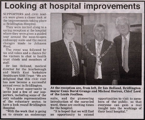 | Looking at Hospital Improvements Bridlington Hospital's future is looking much better at the moment after the problems of approximately 2 years ago. Everyone seems to be working together.......the vast campaigning by the Save Bridlington Hospital Campaigners, Petitions, E-mails, Letters and the support of the Town and its Councillors as paid dividends. The Bridlington Hospital as received money from various sources and is at the moment having a make-over; the Endoscopy Dept is to be completed by the end of this month; the lifts are up and running; other department are not closing now; and we are to have a new heating system fitted before the end of the year. this as got to be very good news for Bridlington; fears of the hospital closing are now a thing of the past; we are now looking to bright and prosperous future......hard work and genuine support from all quarters is the way ahead. This sort of publicity speak volumes for the hard work that as gone into the campaigning; the Save/Support Bridlington Hospital Campaign work will still continue and the Website will continue to supply feed-back to the general public. Your truly Mick Pilling (Chairman) Save/Support Bridlington Hospital campaign. |