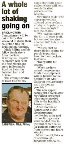 | The Save/Support Bridlington Hospital Campaigners and there helpers will be at Morrison's Supermarket on Friday, 17th December 2004 and in the Bridlington Promenades on Saturday, 8th January 2005, raising money by way of donations for the Bridlington Hospital's Lawrence Unit to purchase a Electronic Chair Scales to help the Stroke Victims and the Severely Disabled. Kindest regards Mick Pilling (Chairman) |