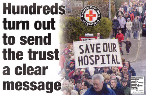FULLY SUPPORTED BY: THE SAVE/SUPPORT BRIDLINGTON HOSPITAL CAMPAIGN GROUP - COME ALONG ONE AND ALL, LET YOUR FEELING BE KNOWN AGAINST THESE LUDICROUS DECISIONS MADE BY THE YORKSHIRE COAST & WOLDS PRIMARY CARE TRUST! You are invited to join in a Peaceful DEMONSTRATION & MARCH against possible Closure/Reduction in ServicesAt Hornsea Cottage Hospital Hornsea - The walk will be from the Seafront by the Marine Hotel on Saturday; 9 th April 2005 at 2.00PM to the Cottage Hospital on Eastgate. Parking available opposite the Marine, at the Leisure Centre or in Morrow Avenue car park, off Cliff Road . Any queries please contact: North Holderness Ward Cllr Polly Worsdale on: 01964- 534302 anytimeNOTE: TELEVISION; RADIO STATIONS & PRESS ARE INVITED! |